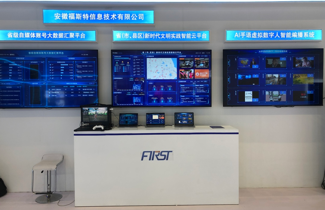 安徽福斯特信息技術(shù)有限公司此次應(yīng)邀參展,以廣電媒體發(fā)展為亮點(diǎn),集中展示大數(shù)據(jù)、人工智能呈現(xiàn)了AI-VLOG視頻智能合成系統(tǒng)+AI手語虛擬數(shù)字人智能編播系統(tǒng)+省級自媒體賬號大數(shù)據(jù)匯聚平臺+省(市、縣區(qū))新時(shí)代文明實(shí)踐智能云平臺技術(shù)。